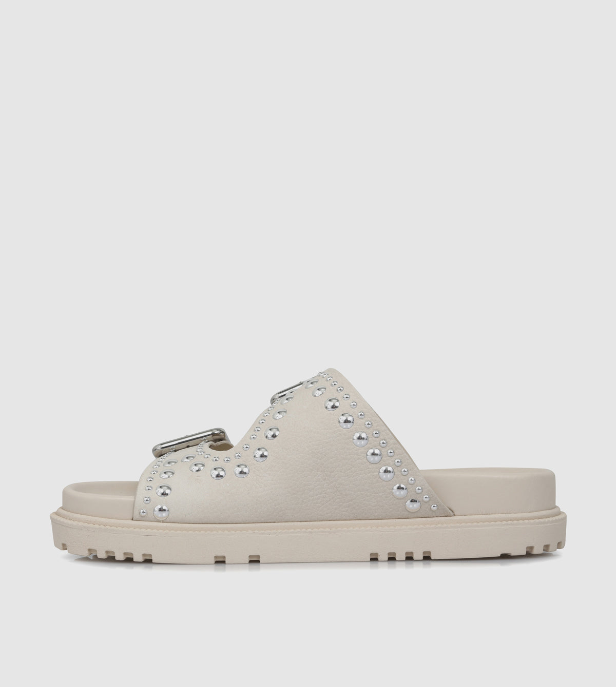 The Tysha Slides by Sempre Di bring contemporary edge to a relaxed summer staple. Crafted in soft neutral leather, this slip-on sandal features dual buckle straps embellished with polished studs for a striking, modern finish. Set on a cushioned footbed with a durable, treaded sole, Tysha delivers comfort and bold style in equal measure — perfect for effortless everyday wear, weekend dressing, and off-duty looks with attitude.