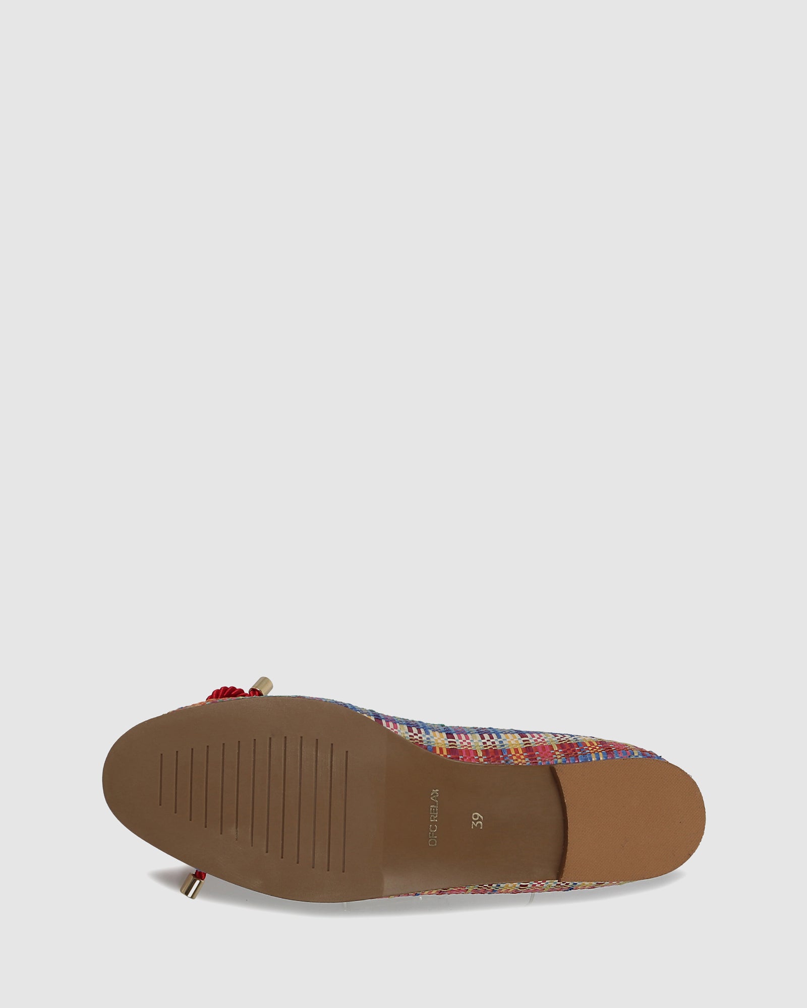 The Jayde Ballerinas by Relax are vibrant, European-made ballet flats designed with a focus on artisanal texture and ergonomic support. These shoes feature a unique multi-colored woven upper with a dominant red palette and a charming nautical-inspired rope bow detail. Built with a low block heel and integrated comfort technology, the Jayde provides a playful yet sophisticated silhouette that ensures all-day comfort.