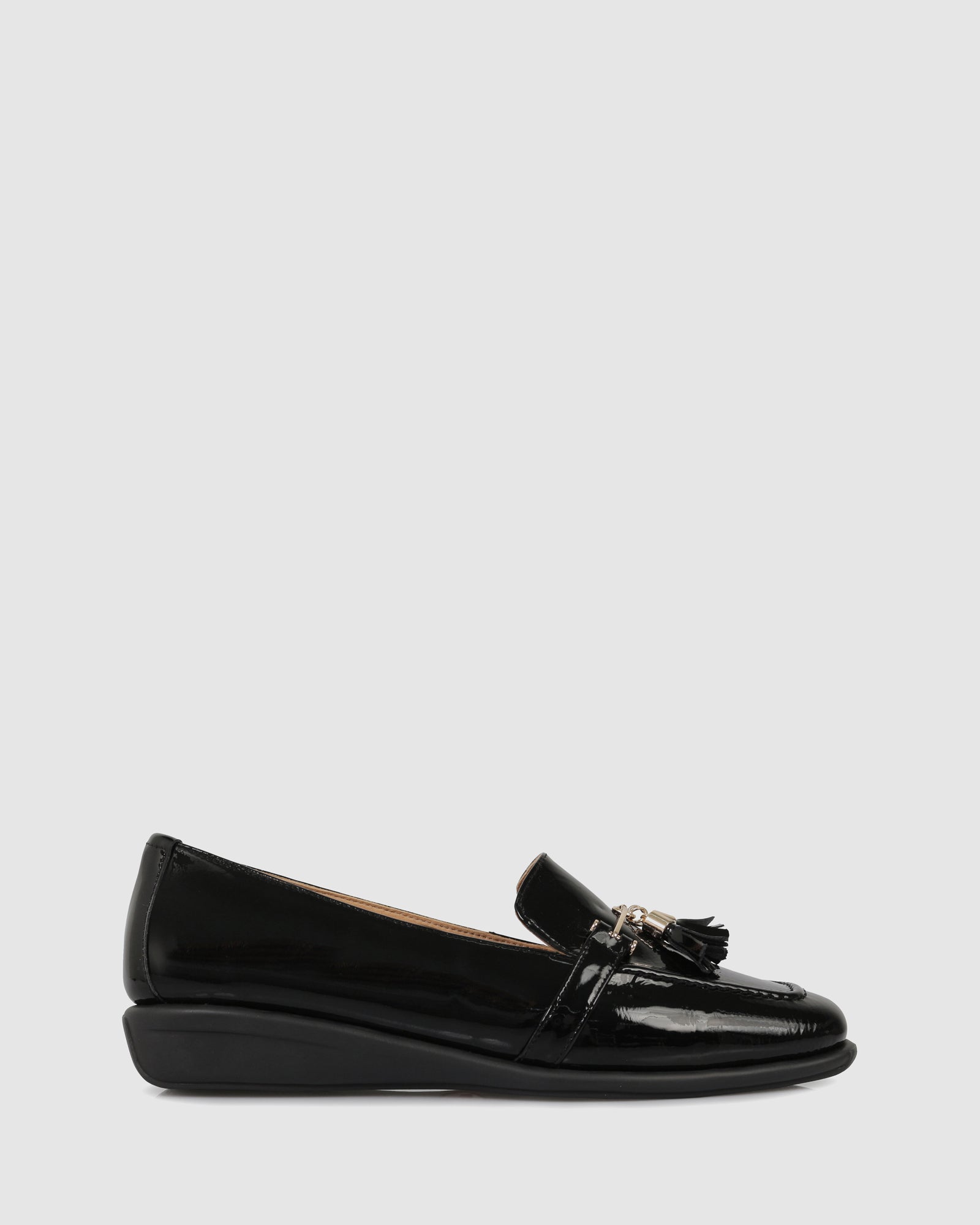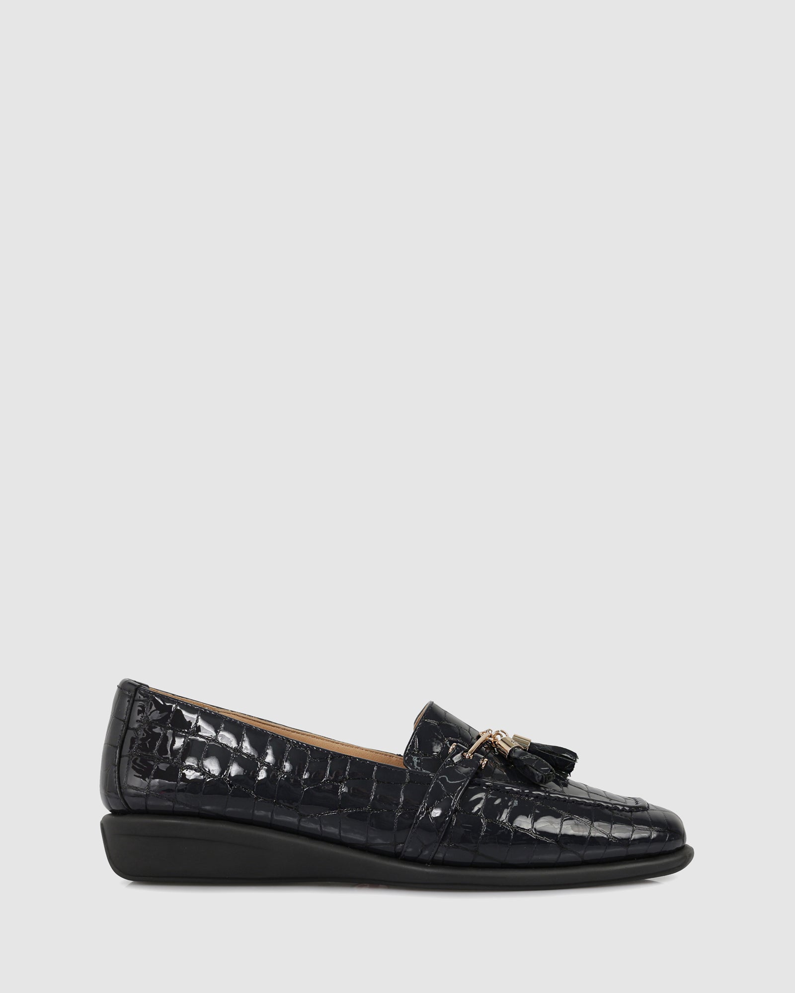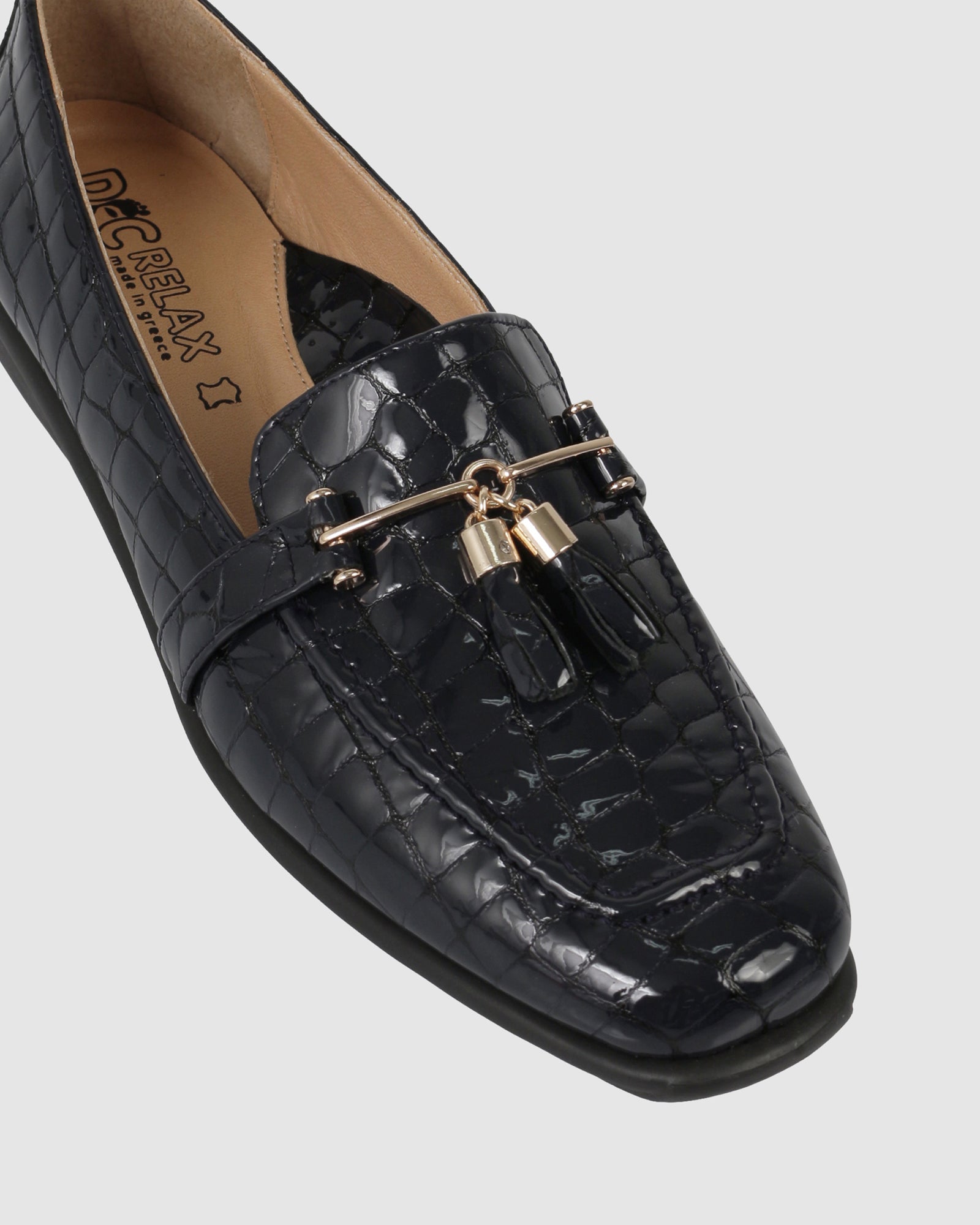 The Meera Slip Ons by Relax are European-made leather loafers that combine classic tailoring with modern ergonomic support. Expertly crafted in Europe, these shoes are available in high-shine patent taupe, classic black, and a striking navy croc-embossed finish. Featuring a 3cm wedge heel for subtle elevation and a decorative tassel-and-bar detail, the Meera provides a sophisticated silhouette designed for all-day comfort.